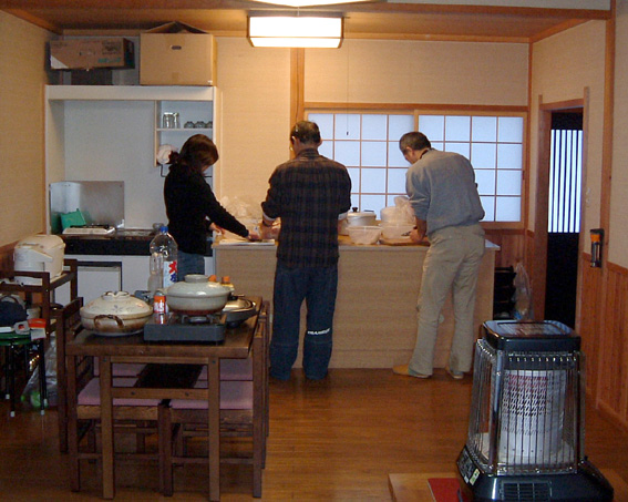 | 下ごしらえ 今夜のメイン食材 かに6kgをさばく とりまとめ役の ごんさん夫妻と 会長さん 右下のストーブが 超強力でした 2006/02/11 飛騨 |